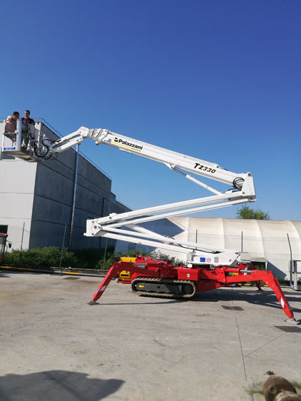 ? 雙鉸鏈?zhǔn)叫”酆蜕炜s節(jié)使得蜘蛛車平臺(tái)高度可以達(dá)到19米,并且2個(gè)人同時(shí)在操作籃內(nèi)操作沒有問(wèn)題。